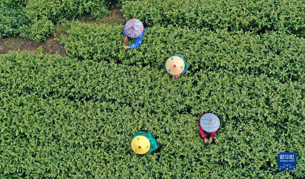 3月26日,在浙江省台州市仙居县横溪镇,村民在茶园采茶(无人机照片)。