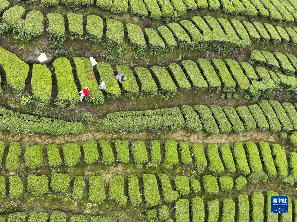 3月26日,茶农在湖北省宜昌市秭归县茅坪镇一茶园采茶(无人机照片)。