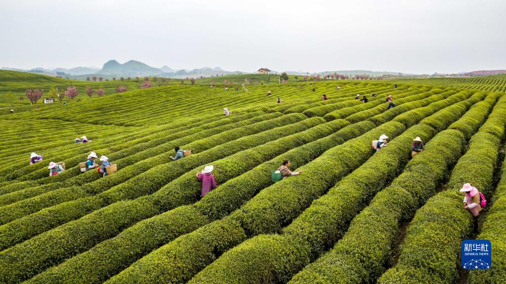 3月26日,茶农在贵州省安顺市西秀区双堡镇一处茶园采茶(无人机照片)。