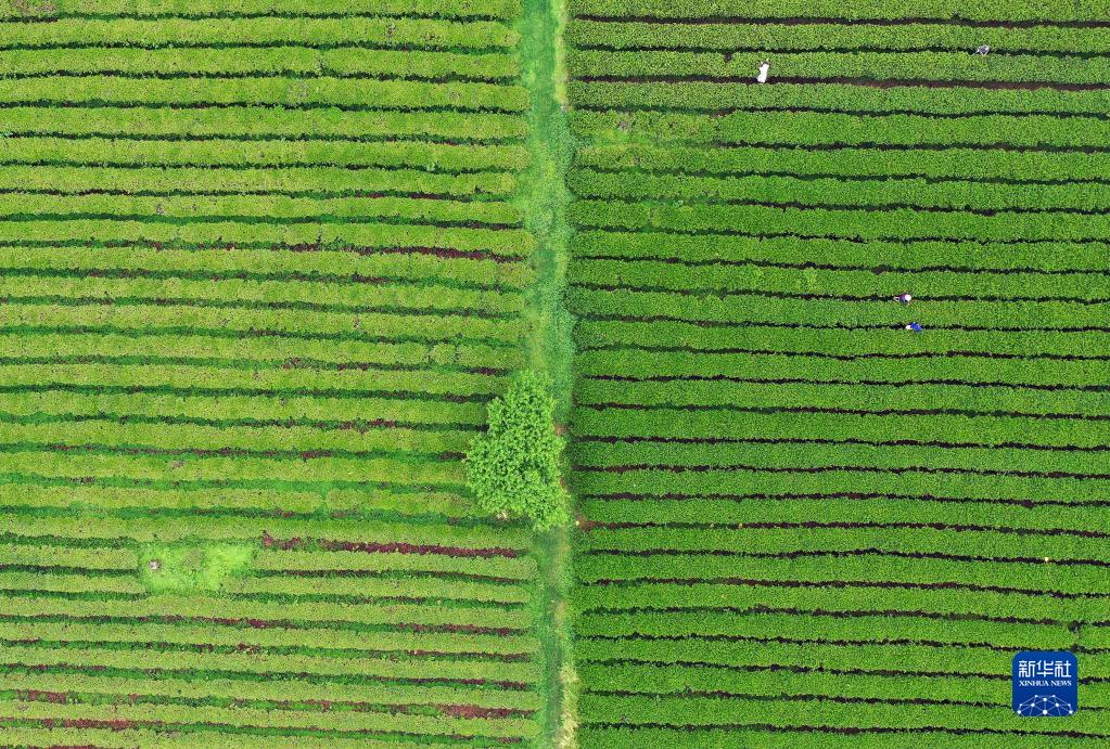 3月26日,茶农在广西柳州市柳城县一处茶园里采茶(无人机照片)。