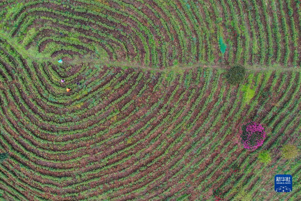 3月26日,茶农在贵州省毕节市百里杜鹃管理区一茶园采茶(无人机照片)。