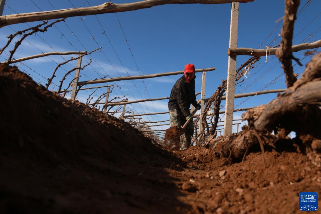 3月25日,甘肃省敦煌市转渠口镇五圣宫村农民对越冬的葡萄藤开沟清土、整枝上架。