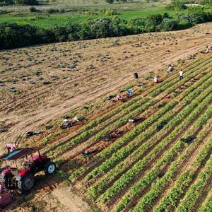 3月26日,工人在文昌市昌洒镇田间采收地瓜(无人机照片)。