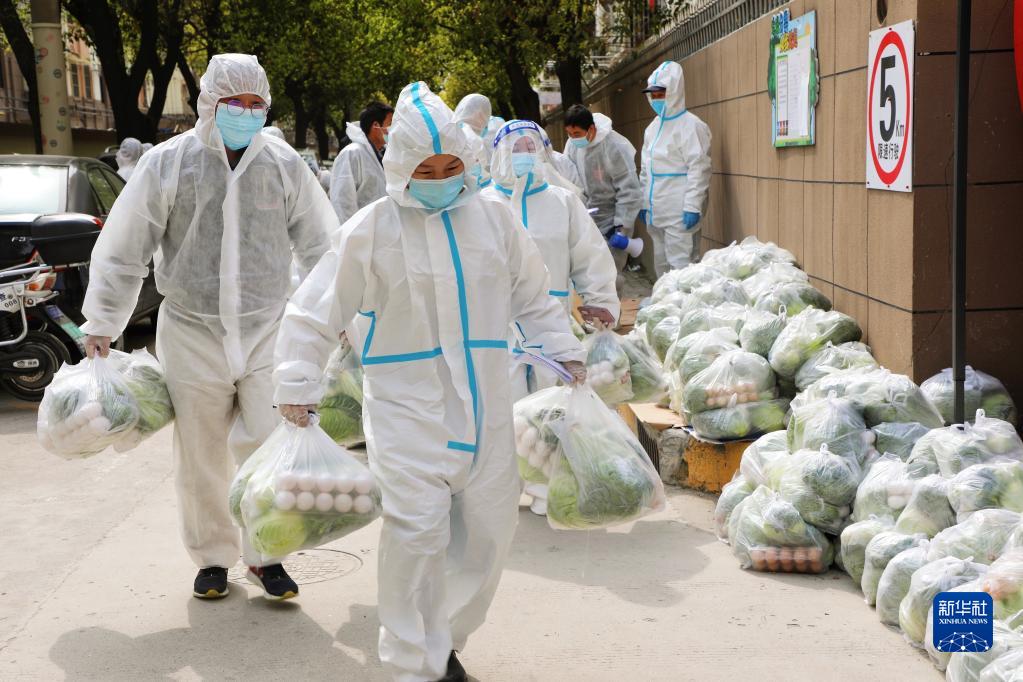 3月28日,上海市奉贤区西渡街道鸿宝一村(南区)的志愿者为居民们送菜。