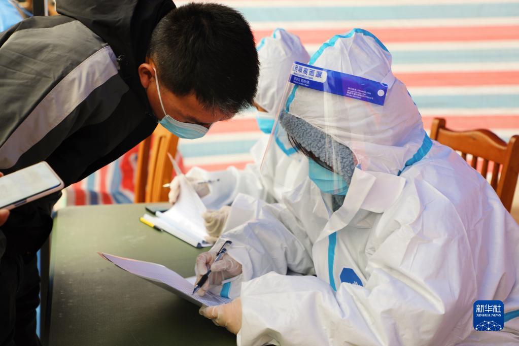3月28日,在上海市奉贤区西渡街道益民村一处核酸检测点,工作人员为居民进行核酸采样登记。