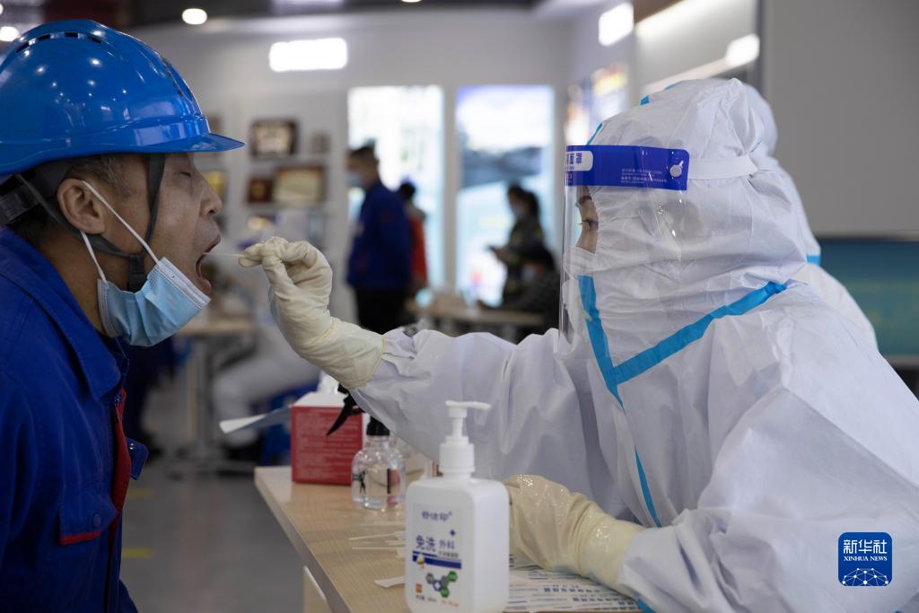 3月28日,工人在哈电集团哈尔滨汽轮机厂有限责任公司接受核酸采样。