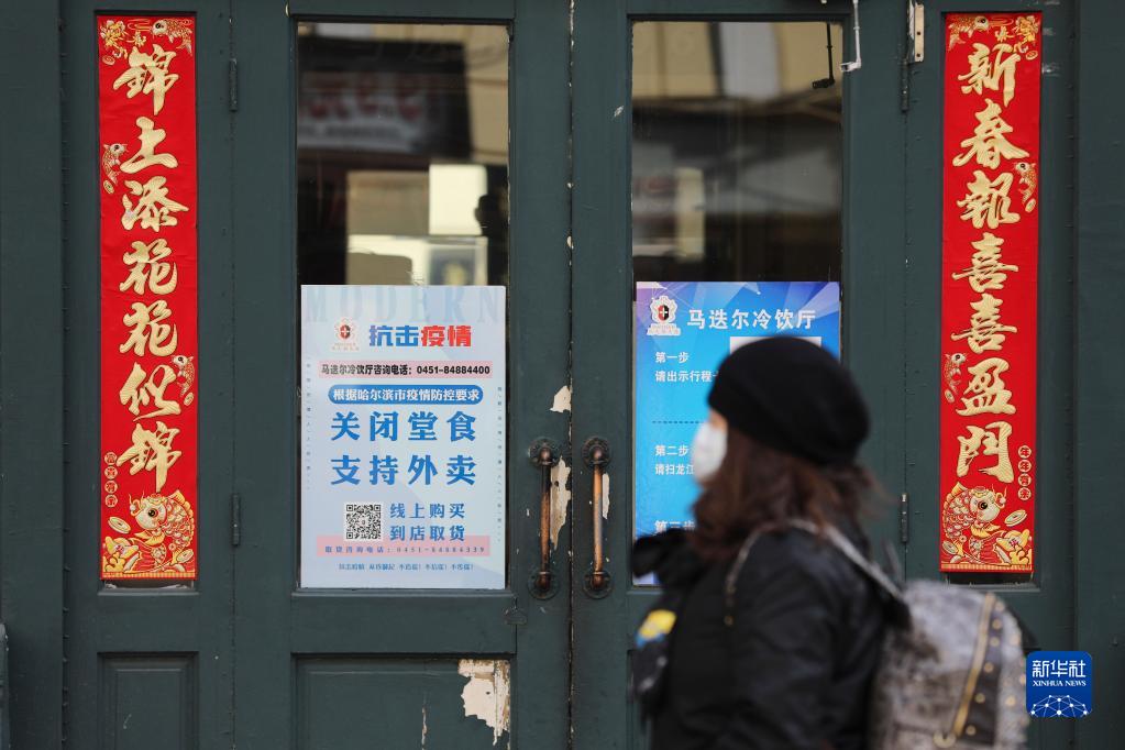 3月28日,在哈尔滨市道里区中央大街上,市民从暂停堂食的商铺前走过。
