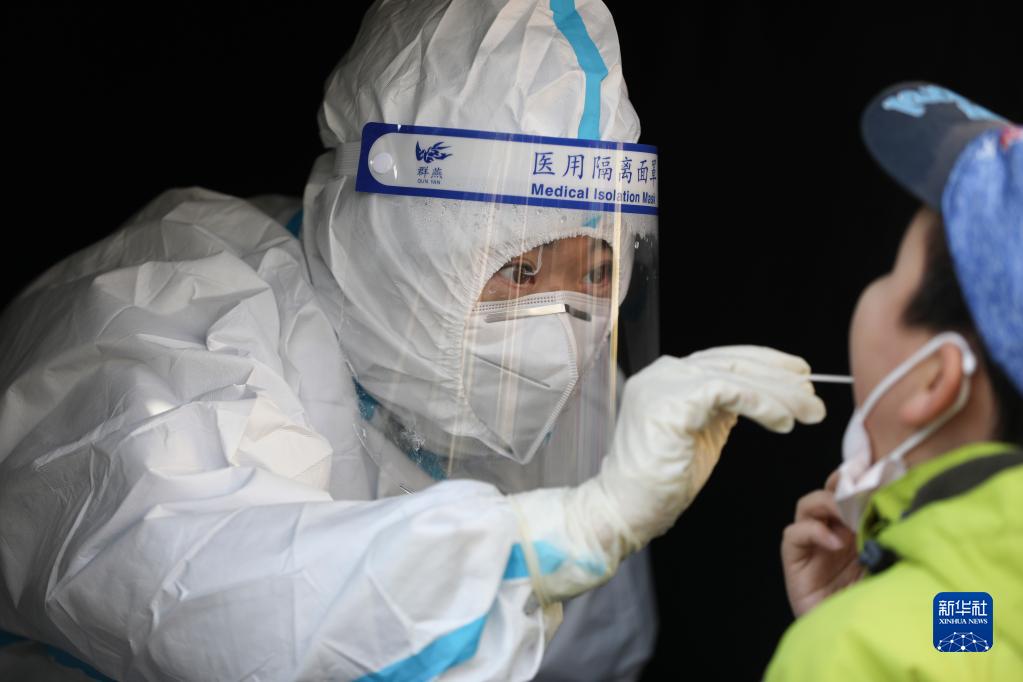 3月28日,在哈尔滨市道里区一处核酸采样点,医务人员进行核酸采样。