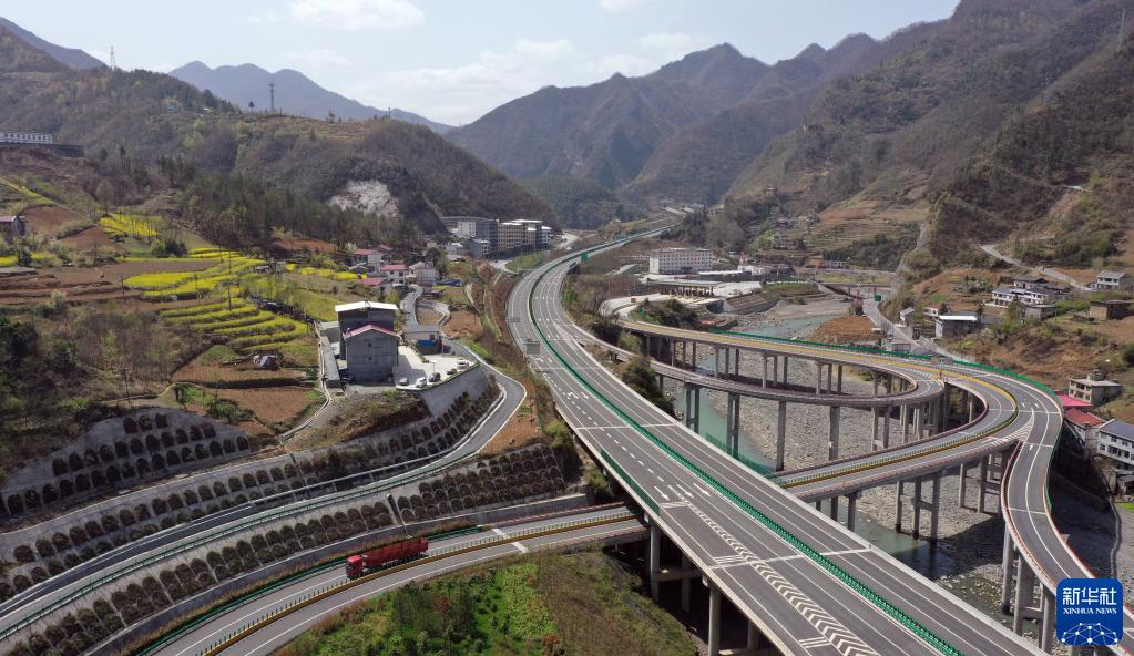 3月28日拍摄的安康市平利县至镇坪(陕渝界)高速公路镇坪出口(无人机照片)。