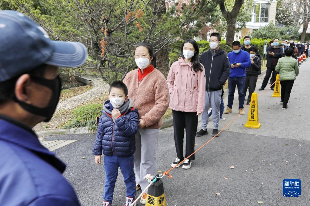 3月28日,在上海市金山区山阳镇一小区,居民排队等待核酸采样。