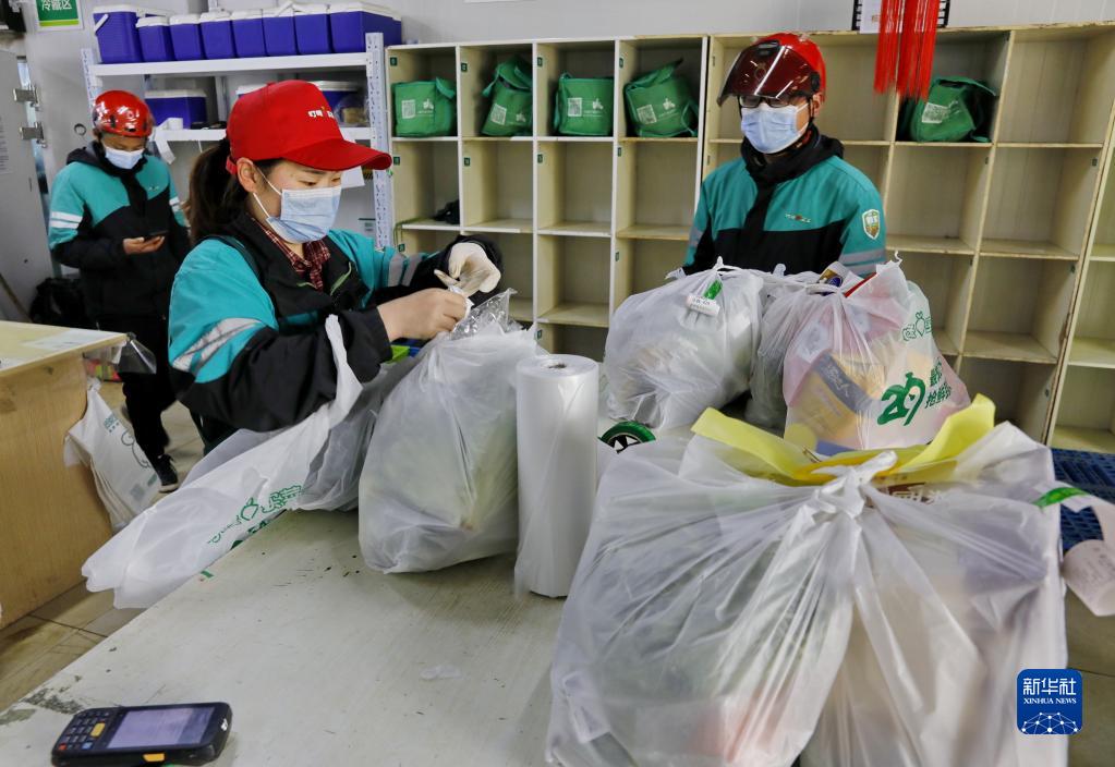 3月28日,在上海市金山区山阳镇的叮咚买菜站点,工作人员在准备为居民配送订单。
