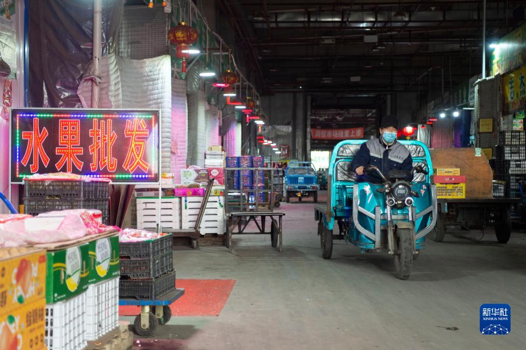 3月29日,在哈尔滨市松北区润恒国际食品交易中心蔬菜区,工作人员在运送货品。