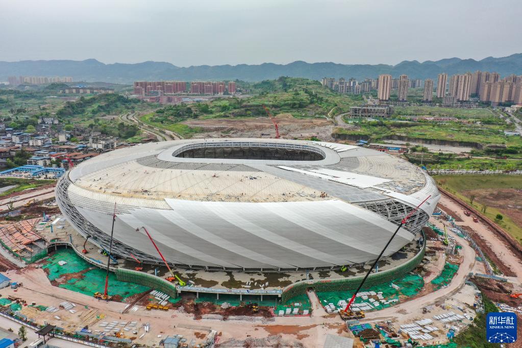 这是3月29日拍摄的重庆龙兴足球场施工现场(无人机照片)。