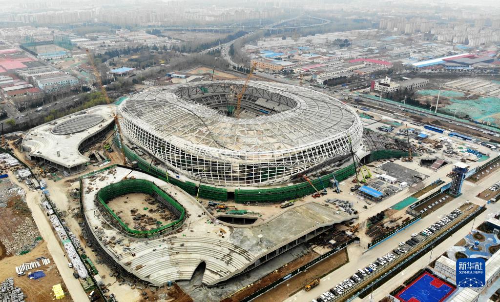 建设中的青岛青春足球场(3月30日摄,无人机照片)。