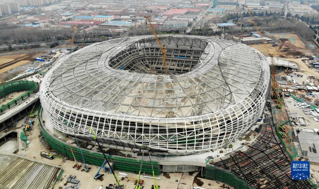 建设中的青岛青春足球场(3月30日摄,无人机照片)。新华社记者 李紫恒 摄