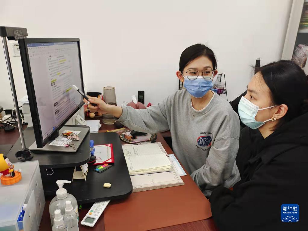3月29日,东北大学的辅导员(左)帮助大学生修改完善简历。