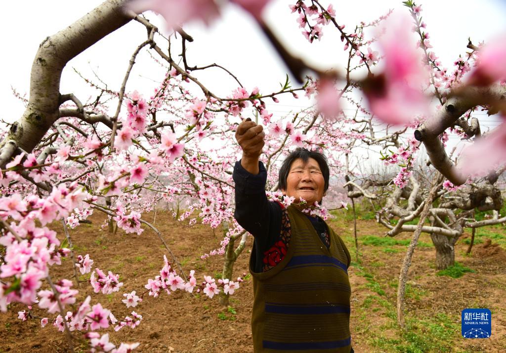 3月30日,山东省枣庄市山亭区水泉镇东堌城村妇女为盛花期的桃树人工疏花。