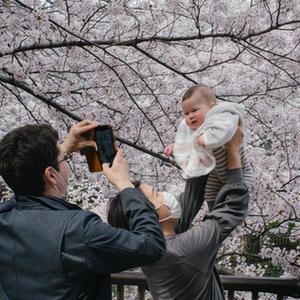 3月30日,人们在日本东京目黑川沿岸的樱花树下拍照。