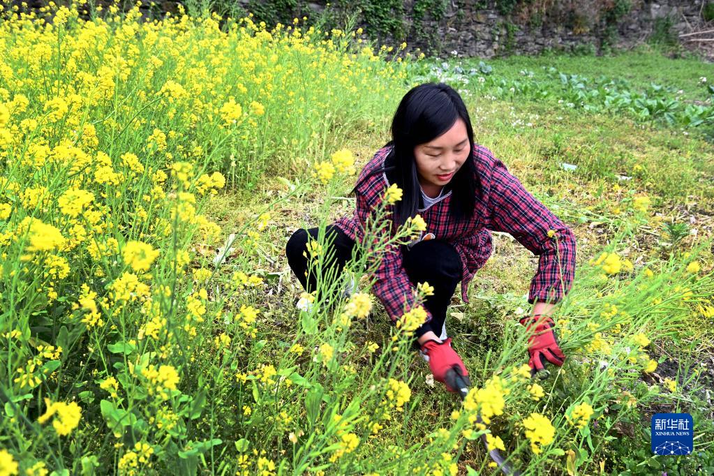 3月30日,杨玲在田间为家禽采割饲料。