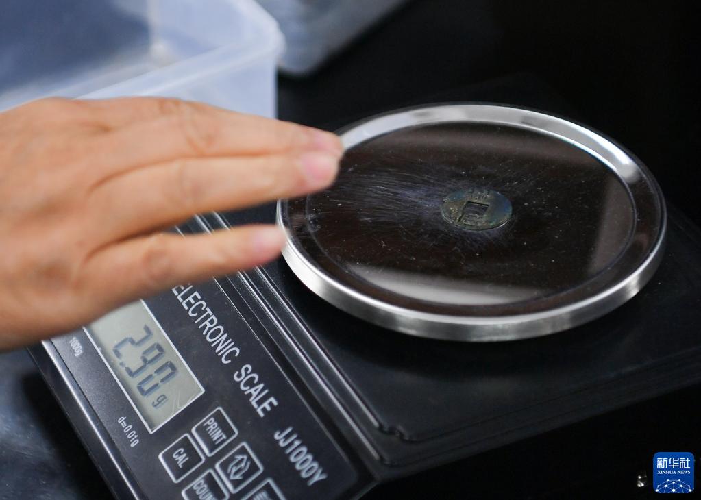 工作人员对陕西西安江村大墓出土的铜钱进行称重(2021年12月16日摄)。