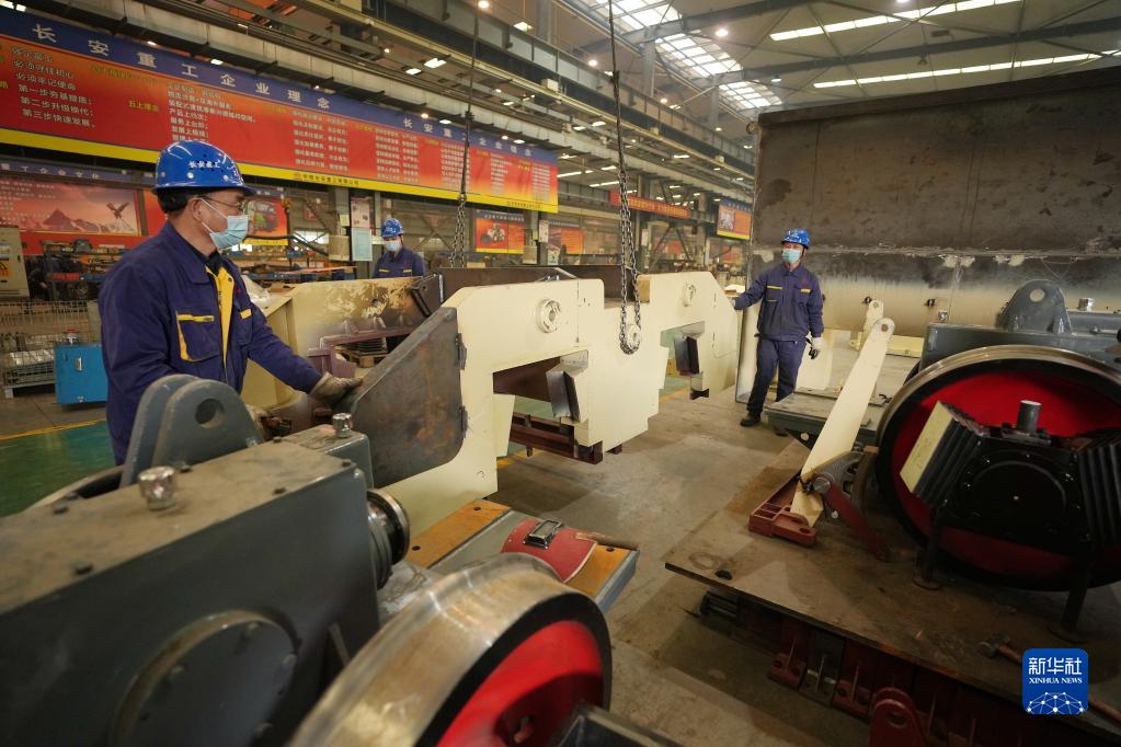 3月31日,在中铁长安重工有限公司,工人在生产线上装配新能源电机车组。