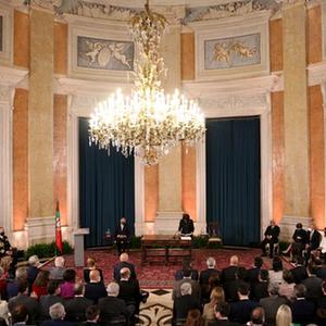 这是3月30日在葡萄牙首都里斯本阿茹达宫拍摄的新政府就职仪式现场。