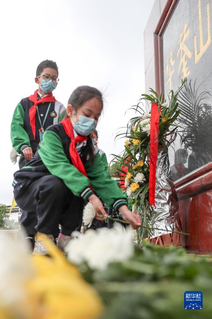 3月31日,四川省华蓥市双河小学的少先队员在红岩广场华蓥山游击队群雕前敬献鲜花,祭奠革命先烈。