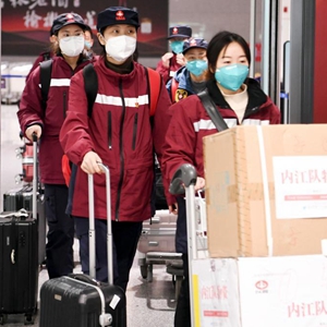 3月31日,四川省第二批援吉医疗队医护人员走出长春龙嘉机场。