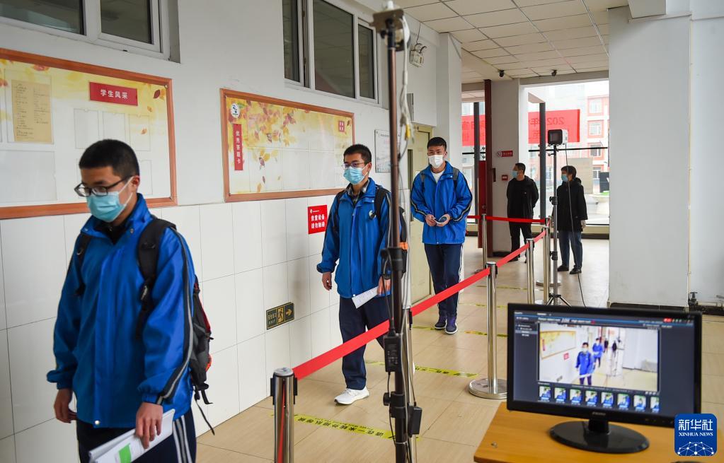 4月1日,高三年级学生走进呼和浩特市铁路第二中学教学楼,体温检测设备查验学生体温。