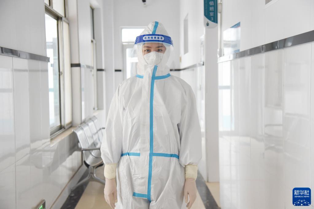 3月29日,在山东省滨州市惠民县胡集镇陈集卫生院,朱梦瑶穿好隔离服准备出发。