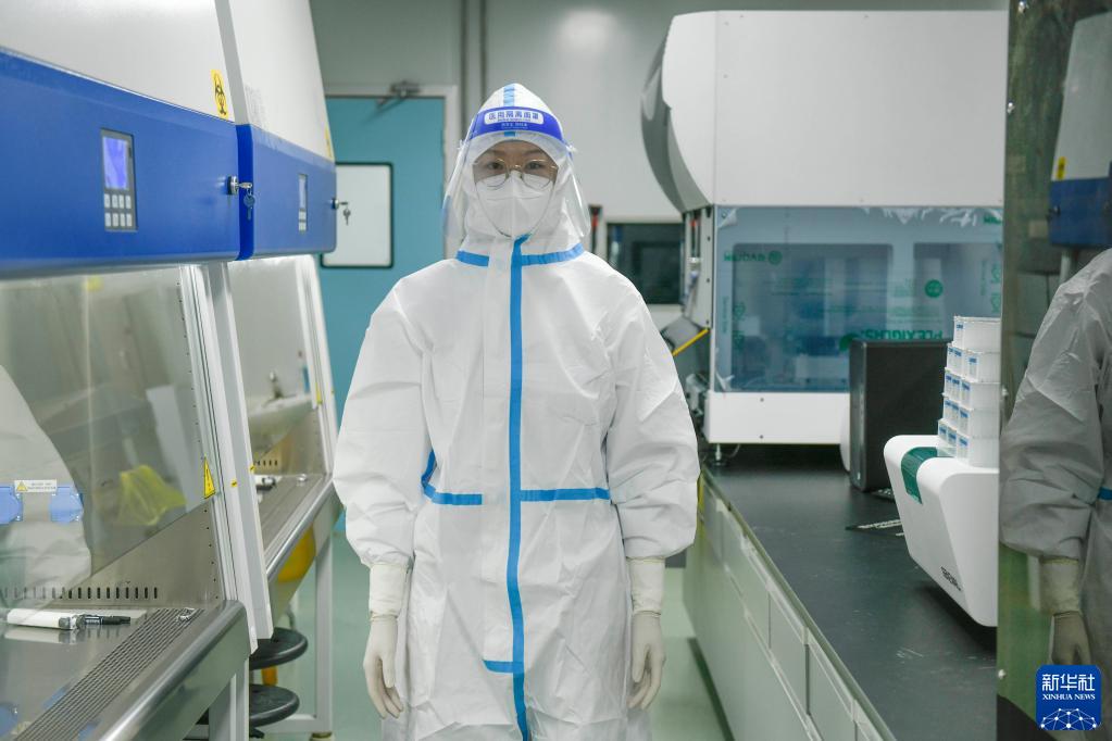 3月29日,在河北省遵化市人民医院,穿戴防护服的核酸检测员雷蕾在样品处理区准备工作。