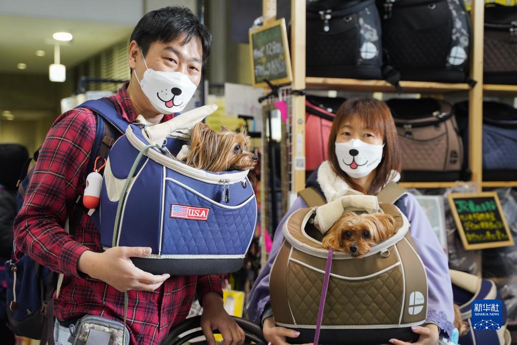 4月1日,人们带着宠物犬在日本东京国际会展中心参加东京国际宠物展。