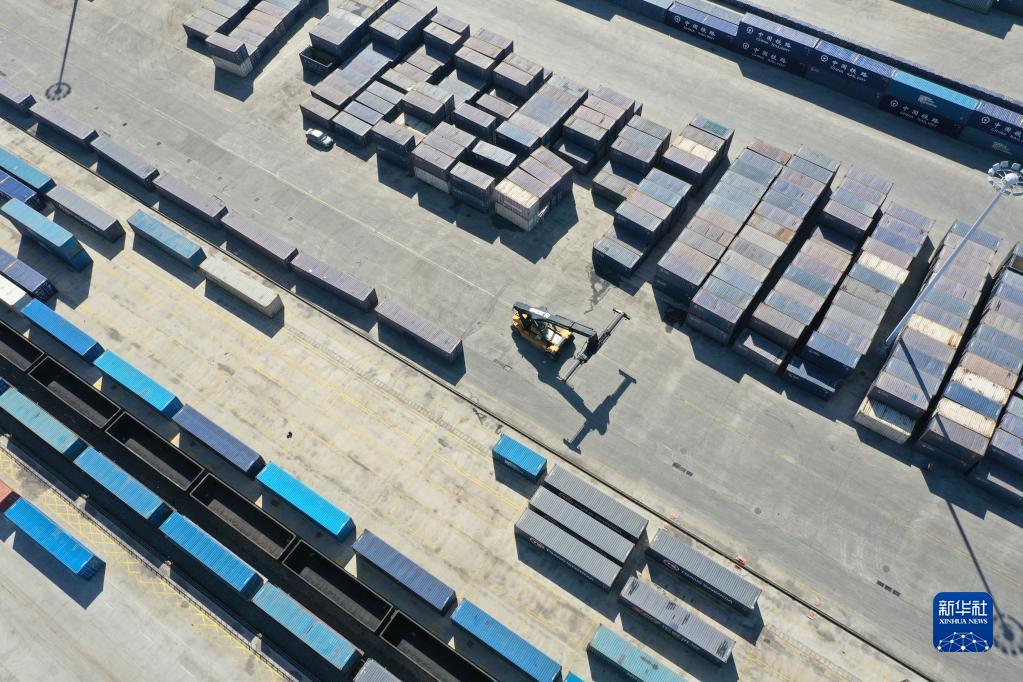 4月1日,在哈尔滨国际集装箱中心站,工作人员调运集装箱进行装车作业(无人机照片)。
