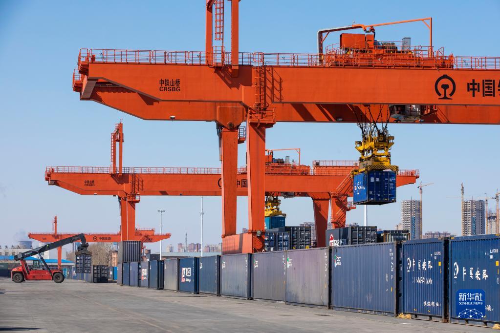 4月1日,在哈尔滨国际集装箱中心站,工作人员调运集装箱进行装车作业。