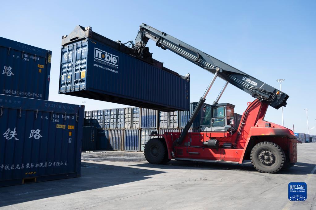 4月1日,在哈尔滨国际集装箱中心站,工作人员调运集装箱进行装车作业。