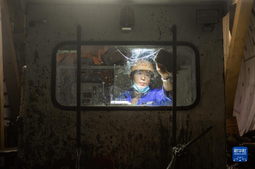 4月1日,工人在武汉地铁前川线工程现场擦拭隧道车前窗玻璃。