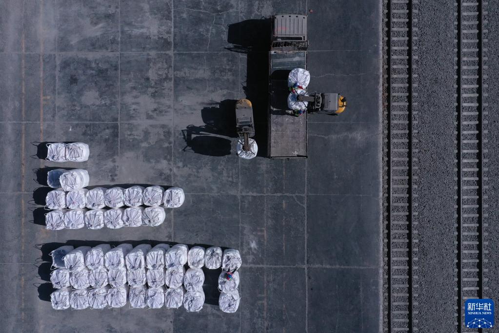 4月1日,在青海盐湖工业股份有限公司钾肥分公司货场,车辆在装运钾肥(无人机照片)。