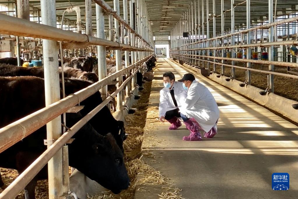 在黑龙江省龙江县的和牛现代化繁殖基地,工作人员查看和牛生长状况(2020年12月3日摄)。