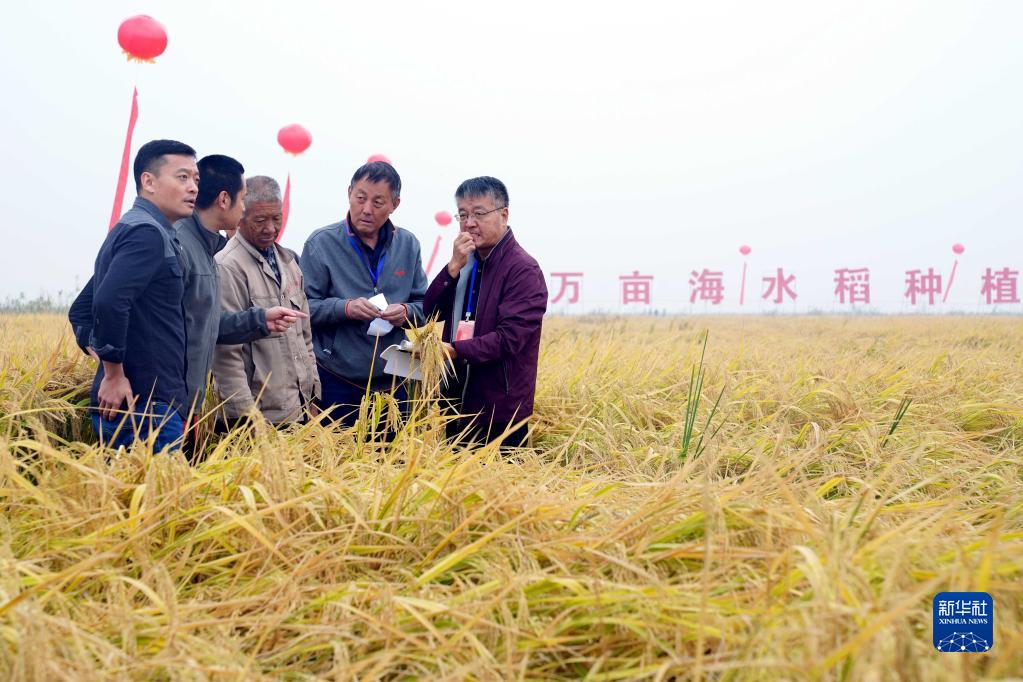 在山东潍坊市寒亭区海水稻三产融合示范基地,专家组成员在进行测产(2020年10月16日摄)。