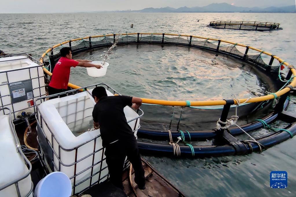 在山东日照市一个海洋牧场,工作人员往养殖网箱投放鱼苗(2020年9月9日摄)。