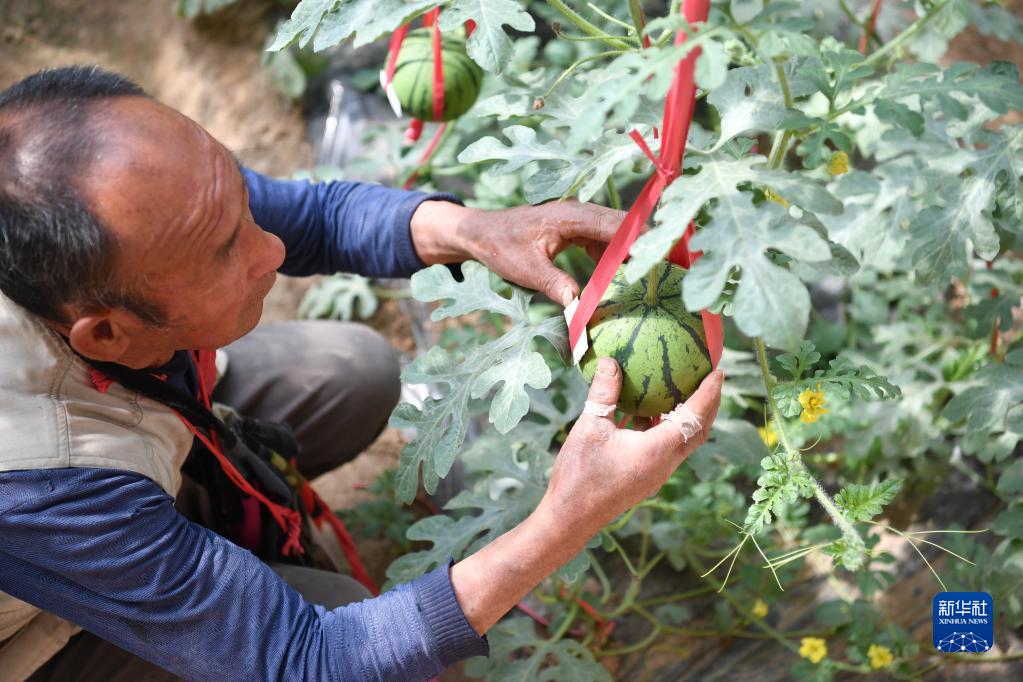 3月31日,延安市延川县关庄镇二八甲村村民姬世录在大棚里查看西瓜的授粉日期。