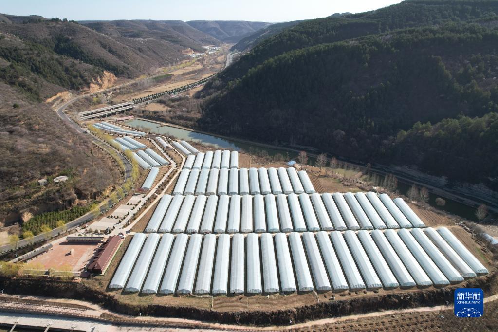 这是延安市宜川县丹州街道王湾村的大棚种植基地(4月2日摄,无人机照片)。