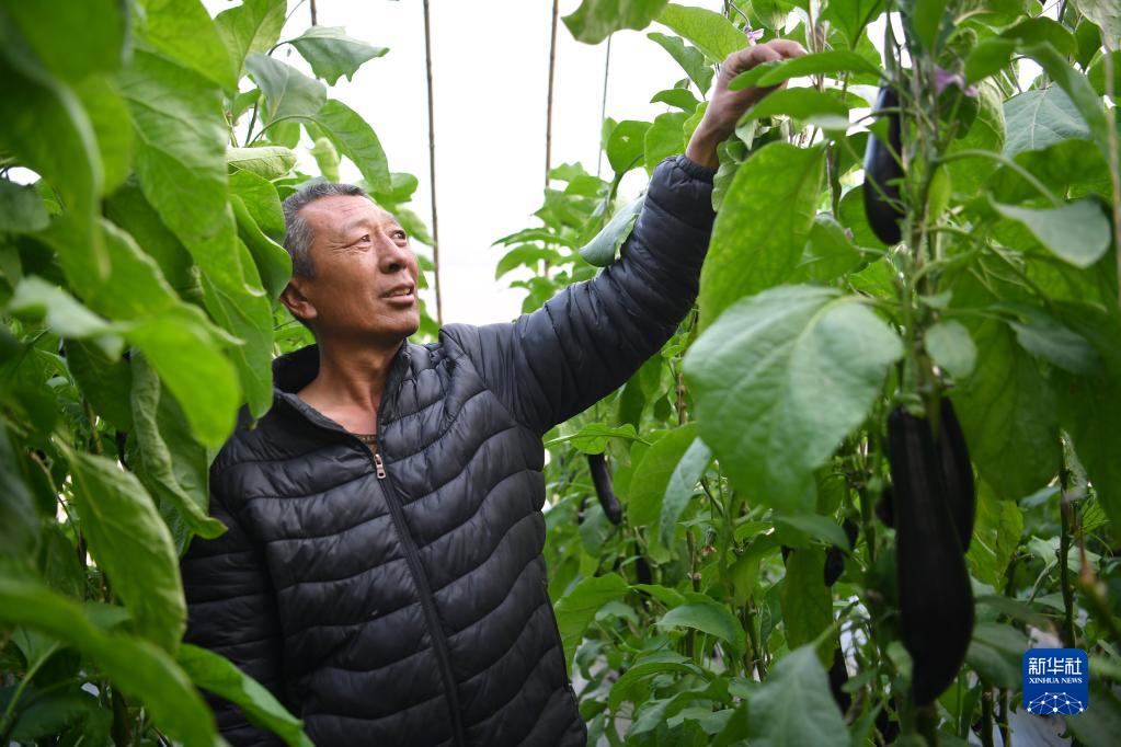3月29日,延安市安塞区化子坪镇张岔村村民王庆平在大棚内给茄子掐尖。