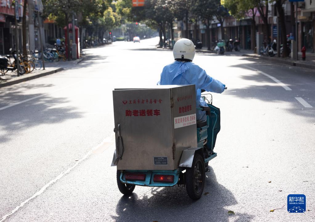 4月2日,在上海市长宁区,工作人员在送餐路上。