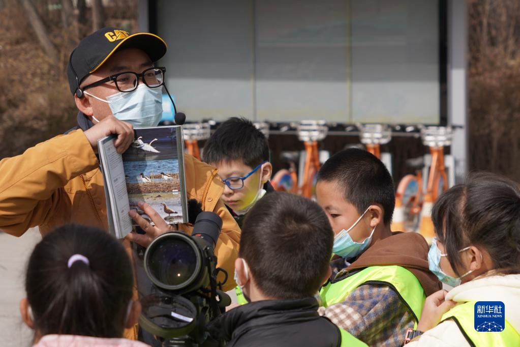4月3日,在青海西宁湟水国家湿地公园,工作人员为小朋友讲解观鸟知识。
