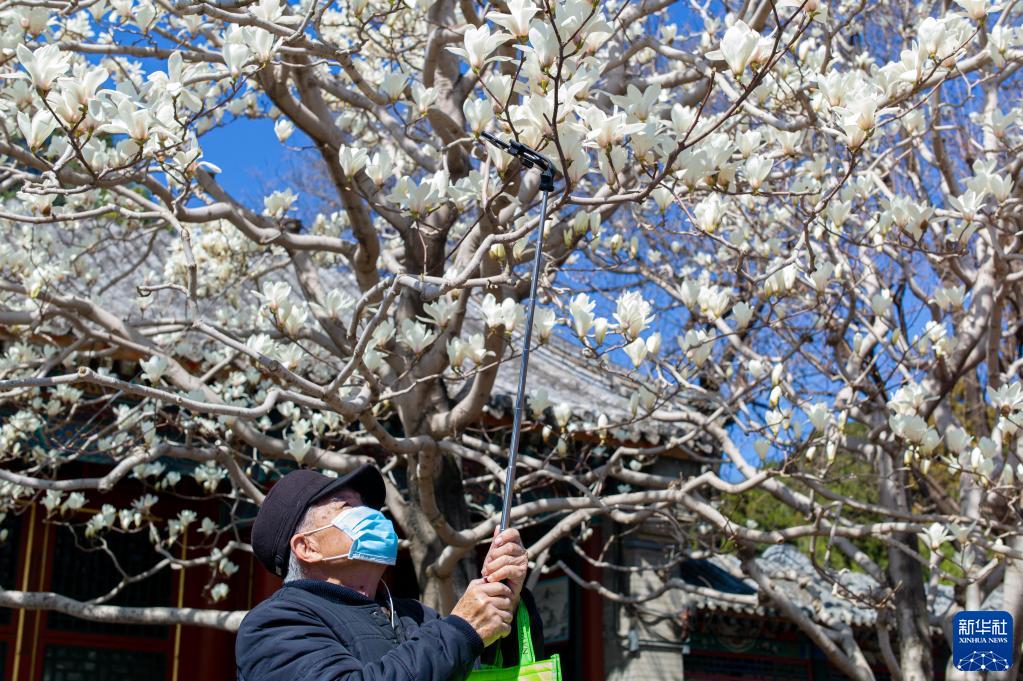 4月2日,游客在颐和园拍摄玉兰花。