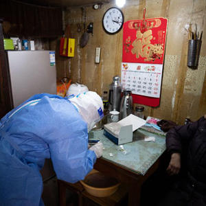 4月3日,在上海市黄浦区豫园街道,工作人员发放抗原检测试剂,指导居民进行抗原检测。