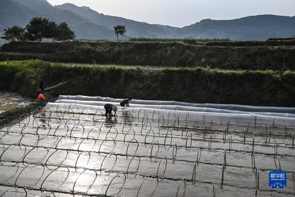 4月3日,平利县大贵镇嘉峪寺村村民在“大田”里进行水稻育苗。