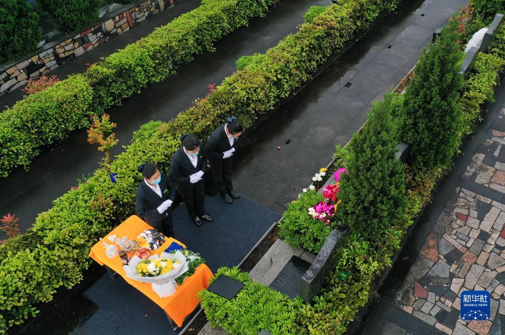 4月1日,游璐(右)和同事一起在重庆灵安陵园进行代客祭扫(无人机照片)。新华社记者 王全超 摄