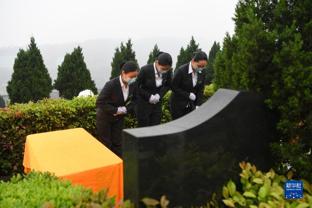 3月30日,游璐(右)和同事一起在重庆灵安陵园进行代客祭扫。新华社记者 王全超 摄
